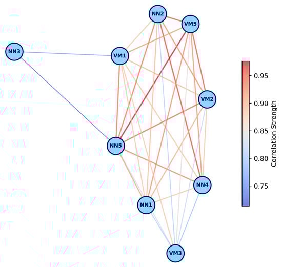 Further annotation of KEGG metabolic pathways using eggNOG-mapper revealed six major functional categories consistently represented across most samples (Figure 3): (i) amino acid metabolism, (ii) carbon degradation, (iii) nitrogen and sulfur metabolism, (iv) oxidative phosphorylation, (v) bacterial secretion systems, and (vi) biofilm formation. These results indicate active microbial participation in amino acid turnover, efficient organic matter processing, and involvement in biogeochemical nitrogen and sulfur cycles, alongside robust energy production via aerobic respiration. The presence of bacterial secretion systems and biofilm formation pathways aligns with the HUMAnN3 annotation, reinforcing the validity of both analyses. The NN3 sample exhibited the lowest functional annotation completeness in the KEGG pathway analysis, while VM4 had no annotated pathways. The distinctiveness of NN3 was further supported by correlation network analysis of sample relationships (Figure 4).