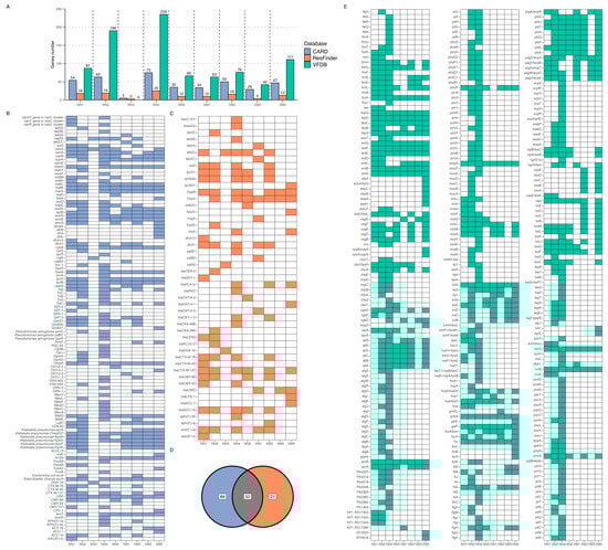 Identification and presence of antibiotic resistance genes and virulence factors across metagenomic samples. (A)—Bar plot of gene counts from CARD, ResFinder, and VFDB databases identified in each sample. Blue bars represent CARD genes, orange bars represent ResFinder genes, and green bars represent VFDB genes. A black dashed line separates the samples. (B,C)—Presence tables for CARD and ResFinder genes, respectively, across the metagenomic samples. (D)—Vienn diagram showing overlapping and non-overlapping identifications of antibiotic resistance genes by CARD (blue) and ResFinder (orange) databases. (E)—Presence tables for VFDB genes across the metagenomic samples. X-axis labels on bar plot (A) and columns in heatmaps (B,C,E) represent samples (NN1–NN5 = Nyctalus noctula, VM1–VM5 = Vespertilio murinus).