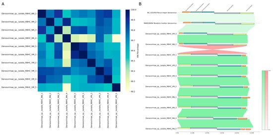 Finally, genome architectures of the densoviruses were compared using pyGenomeViz v.1.5.0 (https://github.com/moshi4/pyGenomeViz, accessed on 10 May 2025). Prokka annotation results were integrated with Proteinortho data to generate a consensus gene map. Viral genomes were aligned vertically, displaying all identified genes. Genomic synteny was assessed using MUMmer v.3.23 [141], with collinear regions depicted as linking bands to highlight homologous segments across genomes.