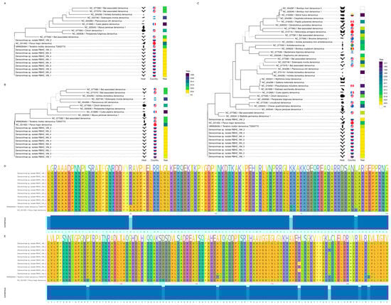 Phylogenomic analysis and protein sequence alignment. (A–C)—Maximum likelihood phylogenetic trees constructed using NSP-1 and SP-1 sequences. (A)—Tree based on NSP-1 and SP-1 using the Q.pfam+I+G4 substitution model. (B)—Tree based on SP-1 using the VT+I+G4 substitution model. (C)—Tree based on NSP-1 using the Q.pfam+F+I+G4 substitution model. Clades with bootstrap support below 70 are shown in gray, while those with higher support are shown in black. Trees are annotated with virus host silhouettes from the PhyloPic database, flags indicating the countries of virus isolation, and a heatmap displaying the years of isolation. (D,E)—Visualization of multiple sequence alignment of SP-2. (D)—Sequence region from amino acid 1 to 100. (E)—Sequence region from amino acid 101 to 213. Consensus sequences are shown at the top, with bar charts below each sequence representing the divergence from the consensus for each amino acid.