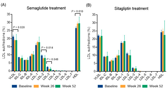 The distribution of lipoprotein subfractions in type 2 diabetic patients during a 52-week semaglutide (A) and sitagliptin treatment (B). The distribution of lipoprotein subfractions was analyzed using a Lipoprint gel electrophoresis system. Abbreviations: IDL, intermediate density lipoprotein; HDL, high-density lipoprotein; LDL, low-density lipoprotein; VLDL, very low-density lipoprotein.