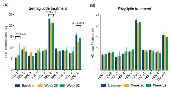 The distribution of high-density lipoprotein (HDL) subfractions in type 2 diabetic patients during a 52-week semaglutide (A) and sitagliptin treatment (B). The distribution of HDL subfractions was analyzed using a Lipoprint gel electrophoresis system.