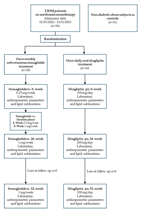 This study was a single-centre, 52-week, randomized trial designed to evaluate the efficacy of the subcutaneous GLP-1RA semaglutide added to metformin monotherapy compared with the combination of baseline therapy with the DPP-4 inhibitor sitagliptin in patients with T2DM. A total of 34 adults with T2DM and obesity were enrolled. After randomisation, 18 patients (12 men, 6 women; mean age: 57.9 ± 10.6 years; mean BMI: 37.96 ± 10.64 kg/m2; mean duration of T2DM: 8.4 ± 3.6 years) were started on once-weekly subcutaneous semaglutide and 16 patients (7 men, 9 women; mean age: 11.9 years; mean BMI: 31.26 ± 2.75 kg/m2; mean duration of T2DM: 9.6 ± 3.2 years) were started on once-daily oral sitagliptin. All diabetic participants were on metformin monotherapy, received statin therapy, and the majority were also treated with an ACE inhibitor, angiotensin receptor blocker, or beta-blocker therapy. In addition, 31 age- and gender-matched obese, non-diabetic subjects (10 men, 21 women; mean age: 55.2 ± 5.0 years; mean BMI: 37.89 ± 9.64 kg/m2) were included as controls who were free of medication. Non-diabetic, obese control subjects were included to distinguish metabolic alterations related to T2DM from those associated with obesity alone.