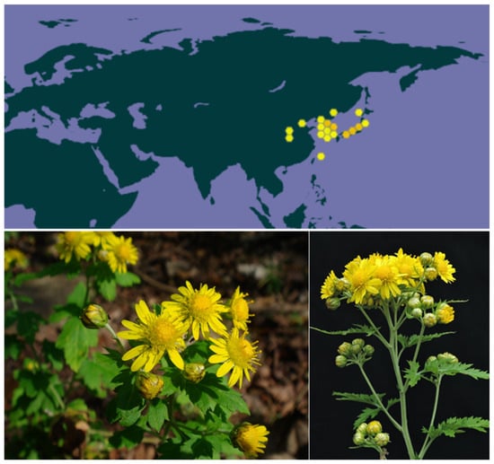 Distribution and illustrations of Chrysanthemum boreale Makino. The distribution map was obtained from the Global Biodiversity Information Facility (GBIF) (https://www.gbif.org/species/10667426) (accessed on 2 June 2025). Yellow and orange dots indicate the presence of the plant. The two photos of the plants are from Prof. Summer’s Web Garden (http://flowers.la.coocan.jp/Asteraceae/Chrysanthemum%20seticuspe%20boreale.htm (accessed on 2 June 2025).