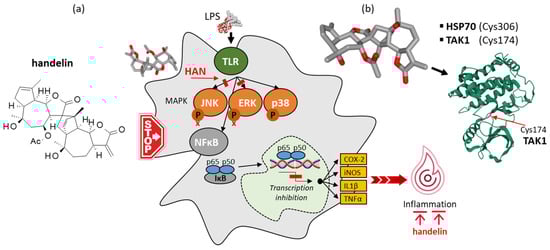 (a) Structure and (b) mechanism of action of dimeric sesquiterpene lactone handelin found in C. boreale. Handelin is also known as yejuhua lactone and chrysanthelide (synonyms). In LPS-activated RAW 264.7 macrophages, handelin (HAN) blocks activation of the NFkB and the MAPK signaling pathway responsible for the induction of pro-inflammatory cytokines. In those cells, HAN (10–40 µM) dose-dependently suppresses the activation (phosphorylation) of JNK and ERK (but not p38) and the upregulation of TNFα and IL1β transcripts [].