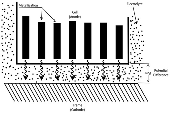 Electrochemical corrosion is the most common and insidious degradation process affecting solar panels. It involves redox reactions between solar cell’s metal contacts and the surrounding environment. Moisture, humidity, and temperature fluctuations contribute to the formation of localized electrochemical cells on solar cell surfaces [19]. Over time, these cells lead to corrosion, causing pitting, etching, or general material deterioration. Electrochemical corrosion can significantly reduce solar cell’s light absorption and energy conversion efficiency, impacting the overall performance of PV modules. Figure 1, modified from previous work [20], shows the electrochemical corrosion mechanism.