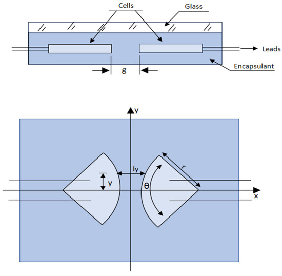 where Q is the charge transfer (C), time of exposition (h), V is the potential applied (V), k is the insulation electrical conductivity (Ω−1 cm−1), t is the effective electromigration conductivity (cm), and ly is the cell-to-cell distance at point y (cm), and Figure 2 altered from prior study [20], which is used for definitions of variables g, r, and , respectively.