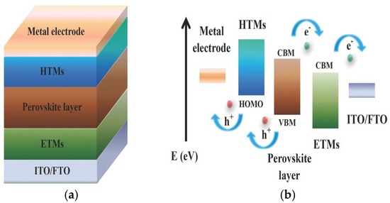 (a) A schematic diagram of general device configuration. (b) The work principle of normal perovskite solar cells [37].