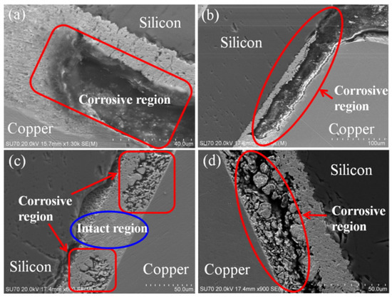 (a)The edge of the soldered connection corroded first. (b) Corrosion extended from the edge to the center at the contact with the Ag electrode. Water may easily cover the edge of a soldered connection, leading to galvanic corrosion. (c) Corrosion reached the center of the soldered connection. (d) The soldered connection is divided into two pieces along the interface [71].