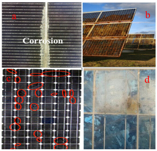 (a) Corrosion in the silicon solar cell. The gas bubbles can grow and merge, increasing delamination. (b) Corrosion in solar panels due to electrochemical processes. (c) The red circles show corrosion within solar panels due to cracks [128]. (d) Moisture and corrosion in modules [116].