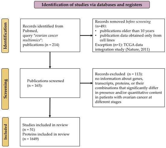 Out of the 165 publications retrieved, we selected 51 papers (Supplementary Table S1) containing information on genes, transcripts, proteins, or their combinations that had been reported to have significant changes in the presence and/or quantitative content in patients with ovarian cancer (e.g., fold change in expression >2 and presence of a mutation or post-translational modification). The study selection criteria were registered in the PROSPERO system as a systematic review (PROSPERO registration number CRD420250614341) []. This study was conducted in compliance with the Preferred Reporting Items for Systematic Reviews and Meta-Analyses (PRISMA) statement []. Eight authors (A.K., E.S., S.T., A.I., A.A., A.K., T.M., and E.I.) independently conducted the study selection process; the data extraction process was divided equally between the researchers. In cases of disagreement regarding the inclusion of a specific study or during data extraction, an agreement was reached through discussion among all the authors. Not all the selected publications described “true multi-omics studies”. In some papers, the results of experiments conducted by different research groups were presented as review articles of multi-omics studies [,,,,,,,].