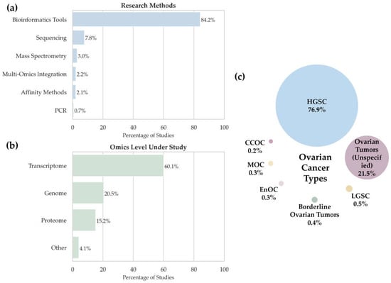 To assess methodological diversity and focus areas in ovarian cancer research, we analyzed studies compiled in Supplementary Tables S1 and S2. Figure 2 summarizes the distribution of studies by (a) analytical methods, (b) omics data types, and (c) ovarian cancer subtypes.