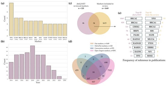 (a) The most common protein biomarkers included in our systematic review. Y axis (Count) denotes the number of publications mentioning each biomarker; (b) temporal trends of publications about ovarian cancer biomarkers in the DisGeNET database; (c) the overlap of biomarkers presented in the DisGeNET database and those identified in our systematic review; (d) comparison of potential markers of four major data sources: DisGeNET, CancerMine, Open Targets, and our systematic review; (e) comparative frequencies of the top 10 biomarkers among the 34 molecules simultaneously found in both the DisGeNET database and this review (numbers next to the bars denote the number of publications).