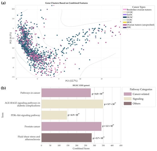 (a) The distribution of genes in the principal component space generated with allowance for integrated features from the UniProt and KEGG databases, where each point corresponds to a separate gene and color indicates the histological type of ovarian cancer. EnOC—endometrioid ovarian carcinoma; HGSC—high-grade serous ovarian carcinoma; SOC—serous ovarian cystadenocarcinoma; (b) KEGG pathway enrichment analysis for identifying the most important signaling and metabolic pathways characteristic of genes in the cluster predominantly containing HGSC-associated genes. The combined score is calculated by multiplying the log of the p-value obtained using Fisher’s exact test by the z-score, which measures the deviation from the expected rank. This allows for the estimation of the significance and rank of enriched pathways.