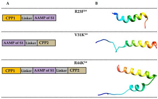 Peptide design scheme (A) and folding patterns of the peptides R23FS*, V31KS*, and R44KS* obtained using the AlphaFold 3 server (B) [30]. Designations: CPP1—fragment of the cell-penetrating peptide TAT, Linker—a sequence composed of glycine-glycine-sarcosine-glycine residues, AAMP of S1—a region containing an amyloidogenic fragment of the ribosomal protein S1 from S. aureus [29], CPP2—fragment of the cell-penetrating peptide Antp. The amino acid sequences of the peptides R23FS*, V31KS*, and R44KS* are provided in the Section 4.