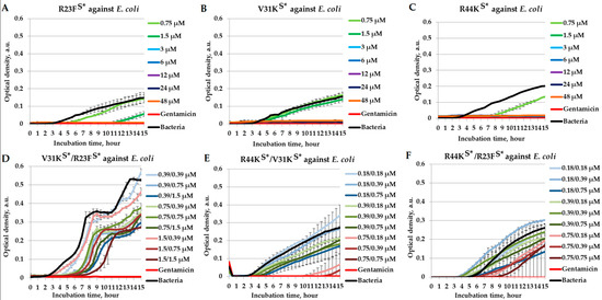 Combinatorial antimicrobial effects of peptides R23FS*, V31KS*, and R44KS* against E. coli (K12 strain) in a liquid medium. The results are shown for different concentrations of the peptides R23FS* (A), V31KS* (B), and R44KS* (C) individually, as well as for the peptide combinations V31KS*/R23FS* (D), R44KS*/V31KS* (E), and R44KS*/R23FS* (F). Bacterial cultures in a liquid medium served as negative controls. Gentamicin sulfate was used as a positive control. Error bars show standard errors. The number of independent experiments is two.