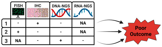 Discordances among current diagnostic methods (FISH, IHC, DNA-NGS, RNA-NGS) that result in poor outcomes. NA: non-applicable, indicates lack of analysis in the citated studies. References for row 1 [9,10,11,12,16,17,18,21,22]. References for row 2 [9,10,11,12,17,19,20,21,22,26]. References for row 3 [17,23,24].