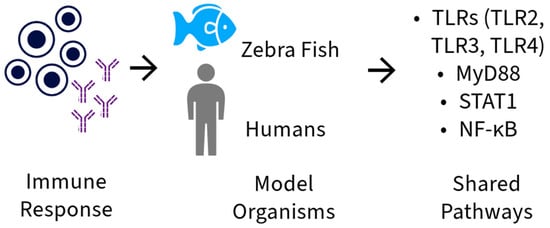 Similarities in immune response pathways between zebrafish and humans, highlighting receptor activation Toll-like: Toll-like receptor 2 (TLR2), Toll-like receptor 3 (TLR3), Toll-like receptor 4 (TLR4), and their myeloid differentiation factor signaling pathways 88 (MyD88), transcription activator signal transducers 1 (STAT 1) and Nuclear Factor Kappa B (NF-κB).