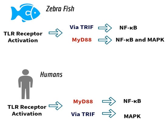 As mentioned, the mitogen-activated protein kinase (MAPK) and the NF-κB are two classic inflammatory signal transduction pathways downstream of the pathways dependent on MyD88 and TRIF. Thus, TRIF can mediate the signaling pathway of NF-κB, as well as that of NF-κB 2 and p65, which are considered important members of the NF-κB family. However, the activation of TLRs/MyD88 not only induces the signaling pathway of NF-κB but also activates the signaling pathway of MAPK, which plays an important role in the regulation of cell growth, migration, senescence, and autophagy [19]. In turn, the imbalance of the signaling pathway of the TLRs can stimulate the activation of the innate immune system in zebrafish, leading to abnormal immune system function [39,40,41,42].