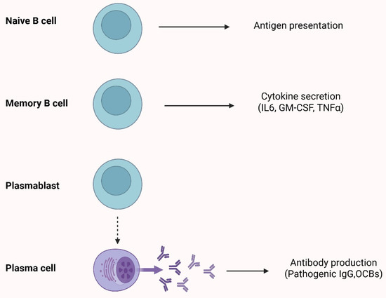 - Cencioni, M.T.; Mattoscio, M.; Magliozzi, R.; Bar-Or, A.; Muraro, P.A. B Cells in Multiple Sclerosis—From Targeted Depletion to Immune Reconstitution Therapies. Nat. Rev. Neurol. 2021, 17, 399–414. [Google Scholar] [CrossRef]