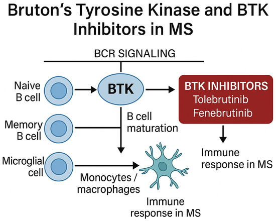 - Airas, L.; Bermel, R.A.; Chitnis, T.; Hartung, H.-P.; Nakahara, J.; Stuve, O.; Williams, M.J.; Kieseier, B.C.; Wiendl, H. A Review of Bruton’s Tyrosine Kinase Inhibitors in Multiple Sclerosis. Ther. Adv. Neurol. Disord. 2024, 17, 17562864241233041. [Google Scholar] [CrossRef] [PubMed]