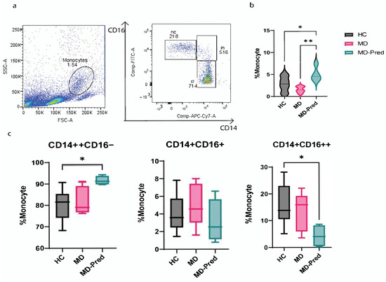 Analysis of total monocytes and subsets in healthy subjects (HCs), non-treated patients with muscle dystrophies (MD), and intermittent prednisone-treated MD patients (MD-Pred). (a) Flow cytometry gating strategy, (b) frequency of total monocytes, and (c) distribution of monocyte subsets. Statistical analysis was performed using one-way ANOVA. The p-value was set as * <0.05 and ** <0.01.