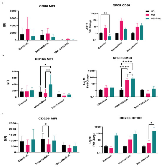 The expression of CD163, the macrophage scavenger receptor, was higher in all subsets of monocytes in MD-Pred patients. Furthermore, the MFI of CD163, assessed by flow cytometry, was higher in MD-Pred patients’ intermediate monocytes compared to healthy controls (HC 168.9 ± 153; MD-Pred 394.3 ± 303, p-value = 0.0177). This was also confirmed by QPCR analysis compared to the healthy controls (fold change MD-Pred = 88.8 ± 210, p-value < 0.001) (Figure 2b).