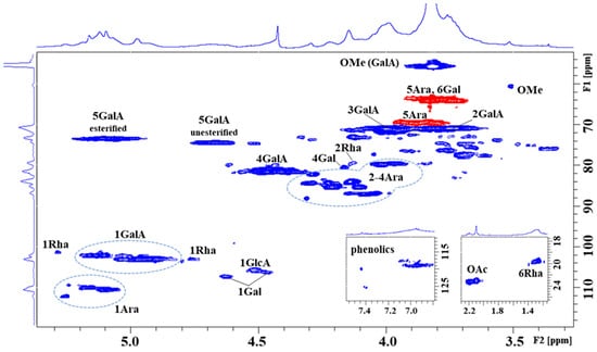 Selected regions of 1H-13C hetero-correlated HSQC spectra (CH—blue colour; CH2—red colour) of the hot water fraction (Hw) of blackthorn fruits.