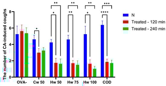 The effect of orally administered P. spinosa complexes Cw (50 mg/kg bw) and Hw (50, 75 and 100 mg/kg bw), codeine phosphate (10 mg/kg bw, COD), and saline (1 mL/kg bw; OVA-) on the number of citric acid (CA)-induced cough efforts in guinea pigs was evaluated. The baseline measurement (N) was recorded before drug administration. Statistical significance was determined using a one-way ANOVA followed by the Bonferroni post hoc test, with * p < 0.05, ** p < 0.01, *** p < 0.001 and **** p < 0.0001 compared to baseline (N).