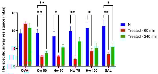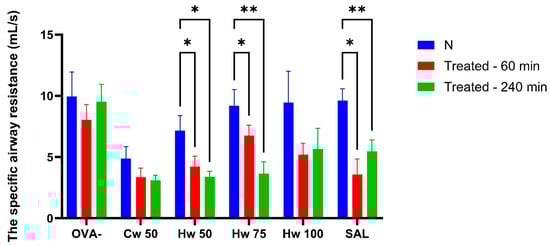 Alterations in specific airway resistance (sRaw) adjusted for respiratory rate (RR) following AC exposure assessed at baseline and at 60 and 240 min post-administration of a cold water complex (Cw) of P.spinosa at a dose 50 mg/kg (Cw 50) and a hot water complex (Hw) at three different doses (Hw 50, Hw 75, Hw 100), salbutamol (SAL), and saline (OVA-). Statistical analysis was performed using a one-way ANOVA with Bonferroni’s post hoc test, with * p < 0.05 and ** p < 0.01 considered significant compared to baseline (N). The baseline measurement (N) was recorded before drug administration.