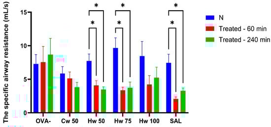 The effect of Cw and Hw complexes and control drugs on sRaw values induced by histamine. Statistical significance was determined using a one-way ANOVA followed by the Bonferroni post hoc test, with * p < 0.05 compared to baseline (N).