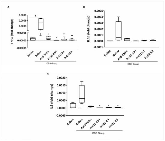 Inflammatory mediators in the intestinal mucosa of DSS-induced colitis after treatment with RvD2 and anti-TNFα in explant culture. mRNA levels (qPCR) of TNFα (A), IL1β (B), and IL6 (C) were measured in the intestinal mucosa of mice from the DSS group compared to the DSS-non-treated group. DSS = dextran sulfate sodium. Saline = biopsies treated with saline. Anti-TNFα = biopsies treated with infliximab at a 100 µg/mL concentration. RvD2 0.01 = biopsies treated with resolvin D2 at a concentration of 0.01 µM. RvD2 0.1 = biopsies treated with resolvin D2 at a concentration of 0.1 µM. RvD2 0.3 = biopsies treated with resolvin D2 at a concentration of 0.3 µM. n = 6. Data are presented as the mean ± SEM. & p < 0.05 was considered statistically significant compared to the DSS-non-treated group. * p < 0.05 and ** p < 0.01 were considered statistically significant compared to the saline-treated DSS group.