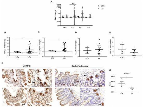 Inflammatory mediators and RvD2 biosynthesis pathway in the ileal mucosa of Crohn’s disease patients. (A) Transcriptional analysis of pro-inflammatory cytokines. TNFα, IL1β, IL6, and L23 mRNA levels (fold change) were measured in the ileal mucosa of Crohn’s disease patients (CD) compared to controls (CTR). (B–E) Transcriptional analysis of genes involved in the RvD2 biosynthesis pathway: (B) PLA2G, (C) 15-LOX, (D) 5-LOX, and (E) GPR18 mRNA levels (fold change) in the ileal mucosa of Crohn’s disease patients (CD) compared to controls (CTR). (F) Immunohistochemical analysis of GPR18 was performed on paraffin-embedded slides from the ileal mucosa of both Crohn’s disease and control groups. The white arrows indicate positive epithelial cells, and the black arrows signal positive cells from the lamina propria; 10× and 20× objective lenses were used as indicated in each image. (G) Quantitative analysis of RvD2 staining in the ileal mucosa of Crohn´s disease patients (CD) compared to controls (CTR). Results are presented as the mean ± SEM. CTR = control group; CD = Crohn’s disease group. n = 7 for CTR and n = 15 for CD in the transcriptional analyses; n = 4 for CTR and n = 4 for CD in the immunohistochemical analysis. * p < 0.05 and ** p < 0.01 were considered statistically significant compared to the CTR group.