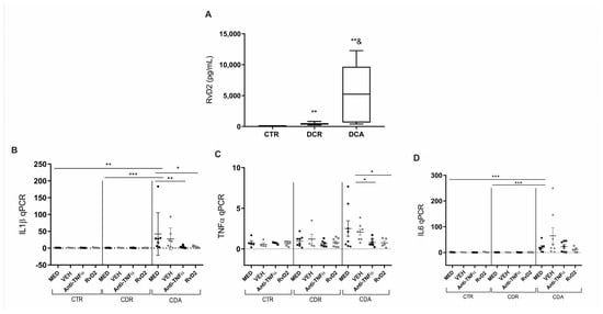 Moreover, transcriptional levels of TNFα were significantly lower in the anti-TNFα (p = 0.01) or RvD2 (p = 0.02)-treated groups compared to the VEH-treated CDA group (Figure 3C). Furthermore, IL6 transcriptional levels were significantly decreased in the MED CTR (p = 0.0007) and MED CDR (p = 0.0003) groups compared to the MED CDA group (Figure 3D). However, neither the anti-TNF nor RvD2 treatment led to the modulation of IL6 transcriptional levels compared to the MED CDA condition.
