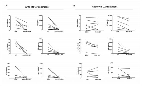 After the treatment with RvD2 or anti-TNFα, the supernatant of CDA was collected and used for cytokine quantification via a multiplex assay. The treatment with anti-TNFα resulted in a significant decrease in IFN-γ (p = 0.03), IL-6 (p = 0.04), IL-22 (p = 0.03), IL-23 (p = 0.04), and TNF-α (p = 0.001) protein expression compared to the control condition of the CDA group (Figure 4A). The treatment with RvD2 induced a significant reduction in IL-6 (p = 0.01), IL-21 (p = 0.04), and IL-22 (p = 0.009) protein expression when compared to the control condition of the CDA group (Figure 4B).