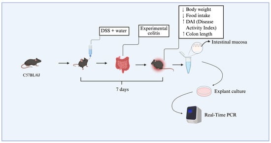 To establish dextran sulfate sodium (DSS)-induced colitis, 12 animals were allocated into two experimental groups (n = 6 per group), each composed of mice with a mean body weight of approximately 25 g. Dextran sulfate sodium salt (DSS), colitis grade (100 g), was purchased from MP Biomedicals (Irvine, CA, USA). The colitis group (DSS group) received 3% DSS (w/v) dissolved in drinking water for seven consecutive days, while the DSS-non-treated group received only standard drinking water. The disease activity index (DAI) was used to assess colitis induction, based on clinical parameters described in the literature, including weight loss, stool consistency, and blood in the feces or perianal region [,]. Daily food intake was also recorded to assess possible changes in dietary consumption associated with disease progression. At the end of the experimental protocol, animals from the DSS group that presented with an increased DAI (≥2.5), significant weight loss, and colon shortening were classified as having experimental colitis, according to previously established criteria by the research group []. Animals were anesthetized using thiopental and euthanized via cervical dislocation, followed by decapitation. Subsequently, colonic tissue biopsies were collected from the DSS-treated and DSS-non-treated groups. These samples were immediately processed and used in explant culture assays (Figure 5).