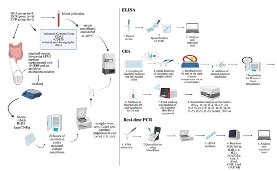 The collected intestinal biopsies were subsequently employed for in vitro assays using explant culture protocols (as detailed in Section 4.8). RvD2 was used at concentrations of 0.01, 0.1, or 0.3 μM, based on a previous study [], to identify the optimal concentration for application in human tissue explant cultures. Additional DSS samples were treated with anti-TNFα (Infliximab, Remicade®, Janssen Biotech, Inc., Horsham, PA, USA) at a dose of 5 mg/kg, corresponding to the therapeutic dose used in humans, or with saline for the DSS-non-treated group. After treatment, the biopsies were used in real-time PCR assays (Figure 5).
