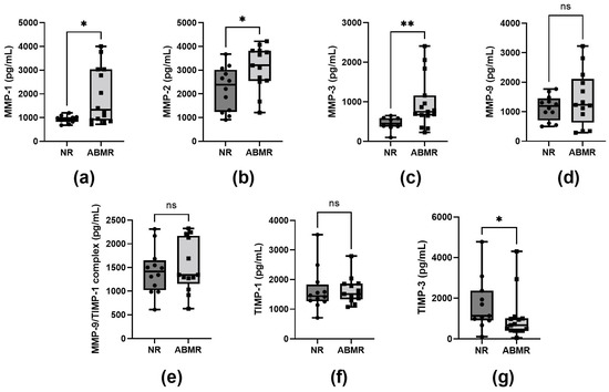 Figure 1. Analysis of plasma levels of matrix metalloproteinases (MMPs) and tissue inhibitors of metalloproteinases (TIMPs) in kidney transplant recipients with and without antibody-mediated rejection (ABMR). (ac) MMP-1, MMP-2, and MMP-3 levels were significantly increased in ABMR patients compared with NR patients. (g) TIMP-3 levels were significantly higher in NR patients. (df) MMP-9, MMP-9/TIMP-1 complex, and TIMP-1 levels did not differ significantly between groups. Data are represented as box plots showing the median and interquartile range. Mann–Whitney U analysis was carried out. Values of p < 0.05 were considered significant. * p < 0.05, ** p < 0.01, ns = not significant.