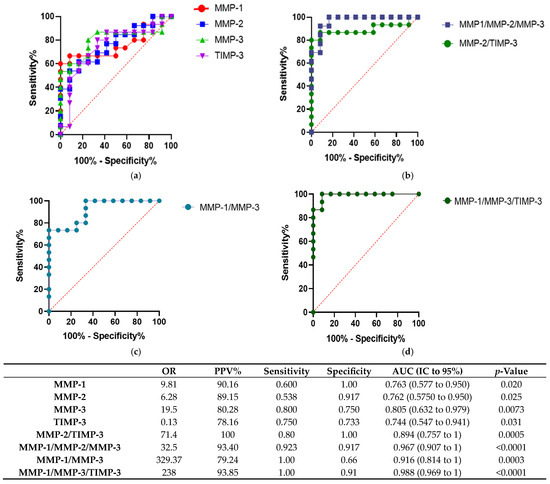 The combined biomarker analysis significantly improved diagnostic accuracy. Specifically, the combination of MMP-1 and MMP-3 yielded an AUC of 0.916 (95% CI: 0.814–1), with a sensitivity of 100%, a specificity of 66%, a PPV of 79.24%, and an odds ratio (OR) of 329.37. Furthermore, the combination of MMP-1, MMP-3, and TIMP-3 achieved an even better diagnostic performance, with an AUC of 0.988 (95% CI: 0.969–1), a sensitivity of 100%, a specificity of 91%, a PPV of 93.85%, and an OR of 238 (Figure 2c,d).