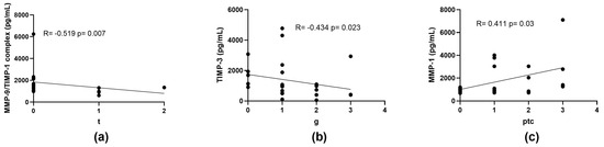 Moreover, we evaluated the correlation of plasma concentrations of MMPs with the severity of histopathological findings in renal biopsies. MMP-9/TIMP-1 complex concentrations showed a negative correlation with the presence of tubulitis (t) (Rho = 0.519, p = 0.007) (Figure 3a). TIMP-3 levels correlated negatively with the severity of glomerulitis (g) (Rho = −0.434, p = 0.023) (Figure 3b), but no significant correlation was observed with peritubular capillaritis (ptc). Conversely, MMP-1 concentrations were positively correlated with the severity of ptc (Rho = 0.411, p = 0.03), but not with g (Figure 3c). Notably, no significant correlations were found for MMP-2 with either ptc or g, despite its elevated plasma levels in patients with ABMR.