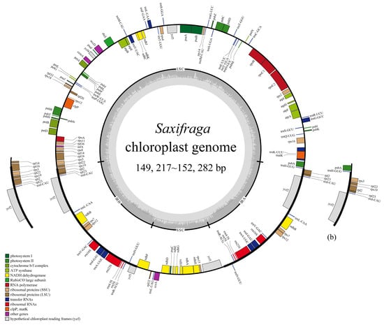 A finely resolved and well supported phylogenetic topology of a given taxonomic group is essential to conduct further evolutionary studies, such as biogeographic analysis, trait reconstruction and ploidy evolution []. However, phylogenetic relationships of lineages which have experienced recent rapid radiation could not be well resolved by traditionally universal DNA markers []. As for the phylogeny of Saxifraga, although the infrageneric skeleton frame at sectional level has been revealed to be based on two universal markers [], phylogenetic relationships within sections were not well resolved [,], partly due to rapid radiation []. Because of the small size, relatively conservative structure and maternal inheritance, chloroplast genomes have been widely applied to plant phylogeny and evolution, e.g., in [,,]. To date, the large chloroplast genome dataset of Saxifraga has been predominantly focused on S. sect. Ciliatae Haw. [], the most species-rich section whose center of diversity is the QTP sensu lato. The phylogenetic relationship was well resolved within this recent-radiation section, indicating a potentially good performance of chloroplast genome data on the reconstruction of phylogenetic relationships at an infra-sectional level of Saxifraga. However, chloroplast genomes from the remaining sections are limited, even absent, especially those from the Alps, which hinders reliable phylogenetic reconstructions both at generic and infra-sectional levels. On the other hand, although the structure and gene content of chloroplast genomes are conserved in most angiosperms, extensive gene losses and large inversions have been detected in several lineages, such as Gentianaceae [,], Asteraceae [,] and Leguminosae [,]. Previous studies [,] have confirmed high conservation in structural organization, gene arrangement and gene content in chloroplast genomes of S. sect. Ciliatae. However, whether this is the case at the generic level of Saxifraga is still unclear due to the asymmetry in the available data of chloroplast genomes between the QTP and Alps.
