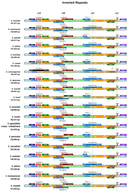Comparison of boundaries of LSC, IR and SSC regions among the 19 Saxifraga chloroplast genomes. Selected genes are indicated by boxes along the genome. Genes above the genome lines indicate their transcriptions in the forward direction, while below is the reverse direction. JLB junction between LSC and IRB, JSB junction between SSC and IRB, JSA junction between SSC and IRA, JLA junction between LSC and IR.