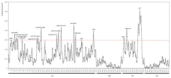 The length, GC content of the total sequence, LSC region, SSC region and IR regions, as well as numbers of protein-coding genes, tRNA genes and rRNA genes, were calculated by command lines using Qt Console v5.5.1. The gene types were counted by CPStools []. A comparison of junction sites of LSC, IR and SSC regions was implemented using the program IRscope (http://msgvd.genehub.com.cn/IRscope/ (accessed on 27 November 2024)) []. The percentage of sequence identity was analyzed and plotted using the program mVISTA (https://genome.lbl.gov/vista/mvista/submit.shtml (accessed on 18 December 2024)) [], with an alignment algorithm of LAGAN. To identify high variable regions, the 19 chloroplast genomes were aligned using MAFFT v.7 [] in PhyloSuite [] with default parameters. The number of polymorphic sites and nucleotide variability (Pi) were evaluated using a sliding window with 200 bp step size and a 600 bp window length implemented in DnaSP v5.10.1 []. Simple sequence repeats (SSRs) were detected using MISA (https://webblast.ipk-gatersleben.de/misa/ (accessed on 8 January 2025)) []. Tandem repeats were identified with Tandem Repeats Finder v4.09 []. Large sequence repeats (LSRs) were identified using REPuter with hamming distance = 3, maximum computed repeats of 50 bp and minimum repeat size of 30 bp []. The codon usage and the relative synonymous codon usage (RSCU) value were estimated using CPStools []. To reduce sampling error, protein-coding genes (PCGs) shorter than 300 bp and the genes utilizing non-standard start codons were filtered. The RSCU plot was created with the online tool Genepioneer (http://112.86.217.82:9929 (accessed on 6 January 2025)). An RSCU value greater than 1 indicates a higher frequency of codon usage, while a value less than 1 indicates a lower frequency [].