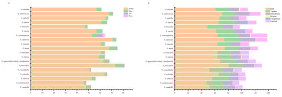 Analyses of repeat sequences in the 19 Saxifraga chloroplast genomes. (A) Number of SSRs types. (B) Number of SSRs, tandem repeats and LSRs.