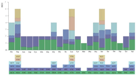Results of relative synonymous codon usage (RSCU) analysis and codon frequency of the 20 amino acids encoded in all PCGs of the 19 Saxifraga chloroplast genomes. The histogram above each amino acid shows codon usage. Colors in the column graph reflected codons in the same colors shown below the figure. Ala: alanine; Arg: arginine; Asn: asparagine; Asp: aspartate; Cys: cysteine; Gln: glutamine; Glu: glutamic; Gly: glycine; His: histidine; Ile: isoleucine; Leu: leucine; Lys: lysine; Met: methionine; Phe: phenylalanine; Pro: proline; Ser: serine; Ter: terminal codon; Thr: threonine; Trp: tryptophan; Tyr: tyrosine; Val: valine. From left to right: 19 Saxifraga species.