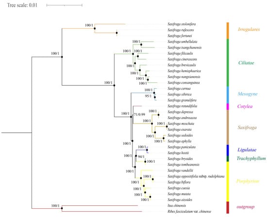 In total, 75 common genes (accD, atpA, atpB, atpE, atpF, atpH, atpI, ccsA, cemA, infA, matK, ndhA, ndhB, ndhC, ndhD, ndhE, ndhF, ndhG, ndhH, ndhI, ndhJ, ndhK, petA, petB, petD, petG, petL, petN, psaA, psaB, psaC, psaI, psaJ, psbA, psbB, psbC, psbD, psbE, psbF, psbH, psbI, psbJ, psbK, psbL, psbM, psbT, psbZ, rbcL, rpl2, rpl14, rpl16, rpl20, rpl22, rpl23, rpl32, rpl33, rpl36, rpoA, rpoB, rpoC1, rpoC2, rps2, rps3, rps4, rps7, rps8, rps11, rps12, rps14, rps15, rps16, rps18, rps19, ycf1, ycf2) were extracted, and phylogenetic relationships were reconstructed using R. fasciculatum var. chinense and I. chinensis as outgroups. Referring to the description of phylogenetic results by Tkach [], firstly, three species—S. stolonifera, S. rufescens and S. fortunei—were clustered together, belonging to sect. Irregulares. Sect. Ciliatae consisted of eight species, including S. umbellulata, S. tsangchanensis, S. filicaulis, S. cinerascens, S. brevicaulis, S. hemisphaerica, S. nangxianensis and S. consanguinea. Sect. Mesogyne included S. cernua, S. sibirica and S. granulifera, while Sect. Cotylea was represented solely by S. rotundifolia. Six species, including S. depressa, S. androsacea, S. moschata, S. exarata, S. sedoides and S. aphylla, were assigned to sect. Saxifraga. Sect. Ligulatae contained S. paniculata and S. hostii. Sect. Trachyphyllum was represented by S. bryoides. Sect. Porphyrion encompassed seven species, including S. tombeanensis, S. vandellii, S. oppositifolia subsp. rudolphiana, S. biflora, S. caesia, S. mutata and S.aizoides. The ML and BI tree topologies were highly congruent and were consistent with previous studies []. The BS and PP values were fairly high, all but three nodes presented a BS value of 100% and all nodes of PP values reached 1, with the exception of one node (Figure 7).