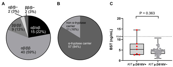 (A) The distribution of tryptase genotypes and (B) the prevalence of carriers with α-tryptase in patients with pediatric mastocytosis. (C) The relationship between BST levels and the presence of KIT p.D816V. The data are presented as boxes and whiskers. The horizontal line within the box represents the median and the box represents the 25th to 75th percentile. The whiskers represent the ranges. KIT p.D816V+ patients are represented by red dots and KIT p.D816V− by grey dots. Mann–Whitney test was used for calculation. BST: basal serum tryptase.