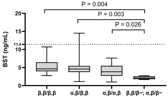 Interestingly, all patients (n = 10 of 10; [100%]) with pruritus were α-tryptase carriers. Of the 68 subjects, only 16.1% (n = 11) were genotyped as ββ:ββ or 0β:ββ (Figure 1). This frequency was 100% lower than the expected prevalence of β genotypes in the general population (32%) [40,41]. The most common tryptase genotype was αβ:ββ (n = 40 of 68; [58.8%]), which is also the most common genotype in the general population (Figure 1) (Table 2) [28,29,41,42]. Additionally, analysis by tryptase genotype showed that patients with the deletion had significantly lower BST levels, with a median of only 2.1 ng/mL, than patients with other tryptase genotypes, which showed no significant differences (Figure 2).