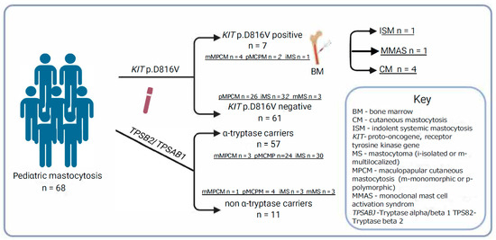 - Lange, M.; Hartmann, K.; Carter, M.C.; Siebenhaar, F.; Alvarez-Twose, I.; Torrado, I.; Brockow, K.; Renke, J.; Irga-Jaworska, N.; Plata-Nazar, K.; et al. Molecular Background, Clinical Features and Management of Pediatric Mastocytosis: Status 2021. Int. J. Mol. Sci. 2021, 22, 2586. [Google Scholar] [CrossRef]