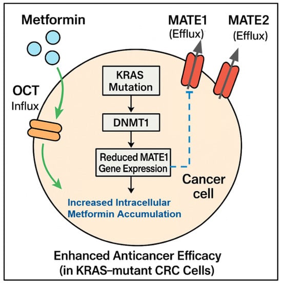 The expression of MATE1 appears to be a key negative predictive biomarker of metformin efficacy. Xie et al. [10] reported an association between KRAS mutation status and MATE1 expression, which helps explain the differential responses. They found that KRAS-mutant tumors exhibited silenced MATE1 expression. Silencing occurs because DNA methyltransferase 1 (DNMT1) causes hypermethylation of the MATE1 promoter, leading to reduced metformin efflux from cells. This indicates that more metformin accumulates inside KRAS-mutant cells. This mechanistic insight provides a molecular reason for the selective vulnerability of KRAS-mutant CRC to metformin and strongly suggests that low MATE1 expression levels are a promising predictive biomarker, particularly alongside KRAS status, for identifying patients who can accumulate sufficient intracellular metformin to achieve therapeutic effects (Figure 1).